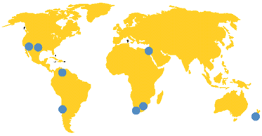 Observatories that the MOA group issues alerts to of selected microlensing events for intensive follow-up. The Mt John observatory appears at the far right. Others are the Wise observatory in Israel, the Boyden and SAAO observatories in South Africa, the MDM and MONET observatories in USA, the CIDA observatory in Venezuela, and the CTIO, EROS and ESO observatories in Chile. The Hubble Space Telescope has also carried out follow-up observations.