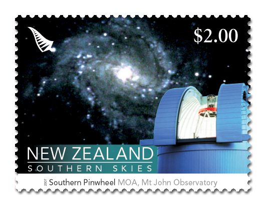 On 6 June 2007 NZ Post issued a “Southern Skies” set of stamps featuring well-known southern objects including the Southern Cross and the Large Cloud of Magellan, and also prominent telescopes. The $2 stamp to the left displays the MOA telescope and the southern pinwheel galaxy. Further information is at Southern Skies
