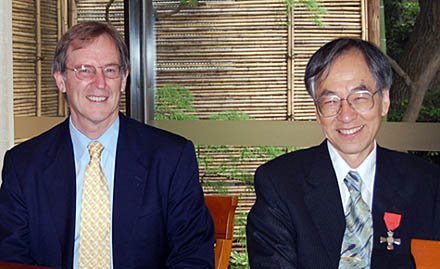 On 25 June 2008 Professor Yasushi Muraki was awarded an Hon MNZM by Ambassador Ian Kennedy of the NZ Embassy in Tokyo to mark 20 years selfless support of joint research in astrophysics by Japan and New Zealand. Those in attendance at the warm and inclusive ceremony, which was conducted entirely in Japanese, included Mrs Muraki, Ambassador Kennedy's wife and son, Drs Fubio Abe and Toshi Yanagisawa of Japan, and Messrs Don Brown, Mark Pearson and Bruce McCallum of the NZ Embassy. Rugby great John Kirwan was honoured at a ceremony at the Embassy the same